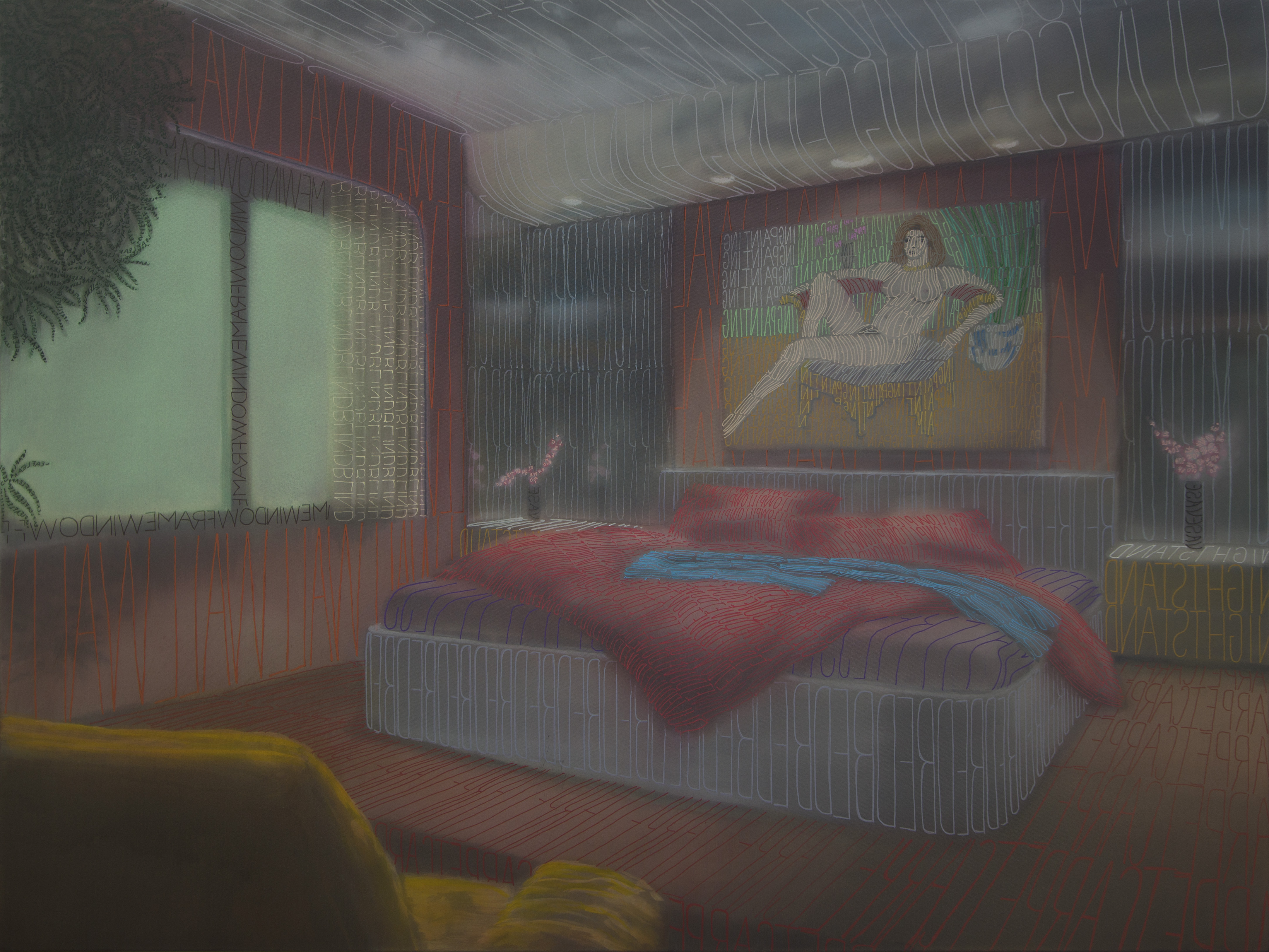 “When I started working on the piece it suddenly struck me that Donald Trump is constantly distorting the truth in what he says and does. I decided to mirror all text on half of the painting and as a ball of lightning I realised that in the context of my work this was a revolution. Suddenly I could create a mirrored world, a false world. From that, MirrorLand was created…”