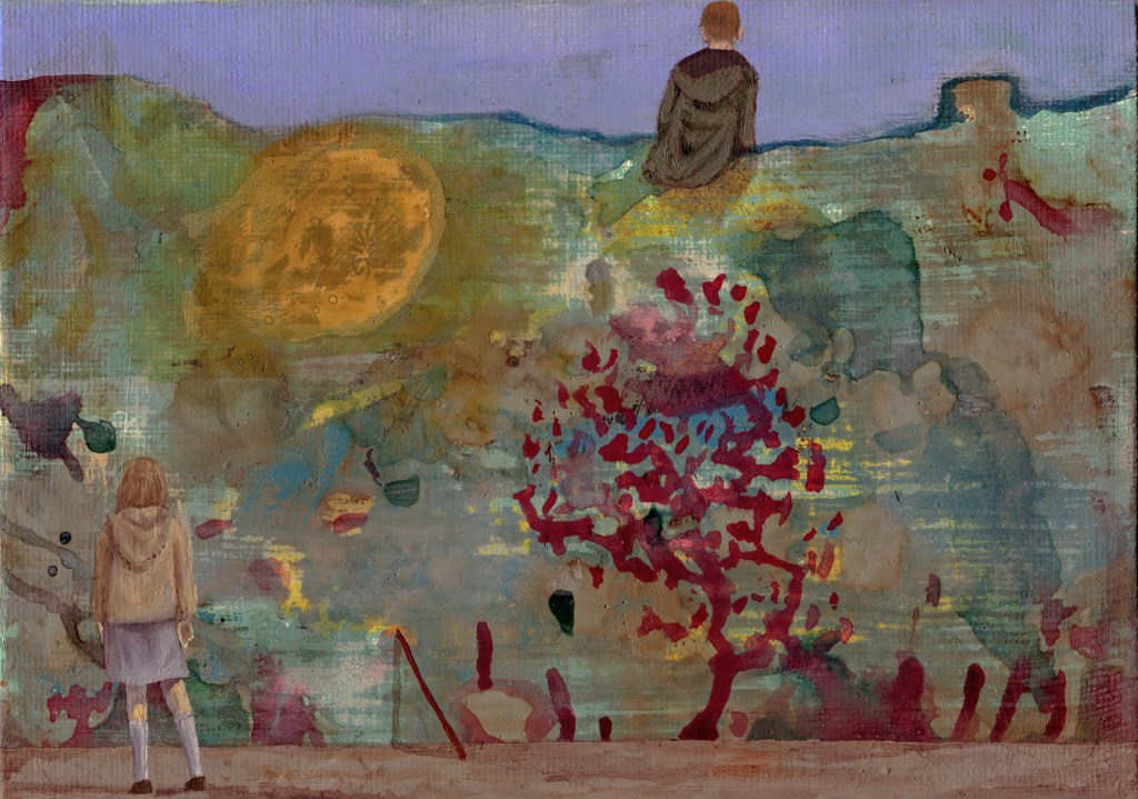 I suppose the characters in my paintings that draw most upon archetypes, and crop up most often would be creators, children, thinkers – roles that are instantly recognizable as signifiers of certain traits almost unconsciously. Children, that signify ‘the innocent’, tend to evoke someone or something; or a part of someone that is uninhibited by the world, in need of a sympathy from the viewer. Delicately painted against a backdrop that may suggest a harsher environment through technique or texture, it’s possible for a viewer to begin to draw a narrative almost without thinking – the notion may just seep in through a cognitive back door.