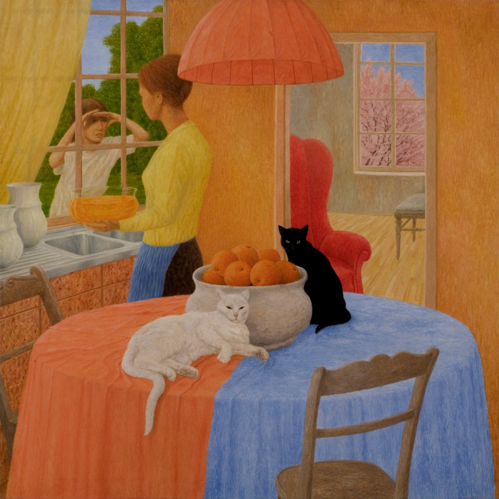 Revolving around scenes and themes from everyday life, my paintings have no distinctive regional features—geographical locations are usually only encoded in the symbolism of the colours and the character of light. Despite numerous changes in the contemporary painting conventions concerning the portrayal of reality, my paintings’ characteristic feature has essentially remained that of composition. My use of composition rests upon an arrangement of forms wherein every potential alteration breaks down a cohesive construction and leads to a deterioration of harmony. As such, my paintings are not readily ascribed to trends in the history of contemporary art. I think that the key to my works lies not in their contexts or themes but in my approach to composition.
