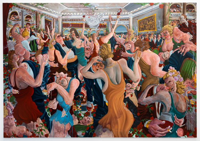 “When I started working on the piece it suddenly struck me that Donald Trump is constantly distorting the truth in what he says and does. I decided to mirror all text on half of the painting and as a ball of lightning I realised that in the context of my work this was a revolution. Suddenly I could create a mirrored world, a false world. From that, MirrorLand was created…”